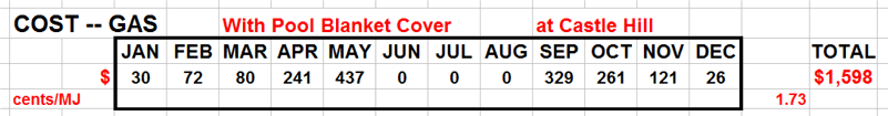 Cost figures are also available when a solar pool blanket does NOT cover the Castle Hill swimming pool. Click here to see these figures for a gas pool heater and here for a heat pump pool heater. The spreadsheet modelling indicates that in both cases the normal heater running cost is at least halved if a solar pool blanket is used.