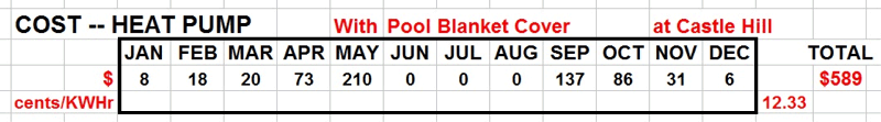 From the table above, maintaining the water at a temperature  25° C for September 5 – 30 (= 26 days) should cost $(26x137÷30) ~ $120, using the blanket cover in combination with the heat pump.  The total heat pump running and jump start cost should be about $130 for September. That's about $4.50/average day.